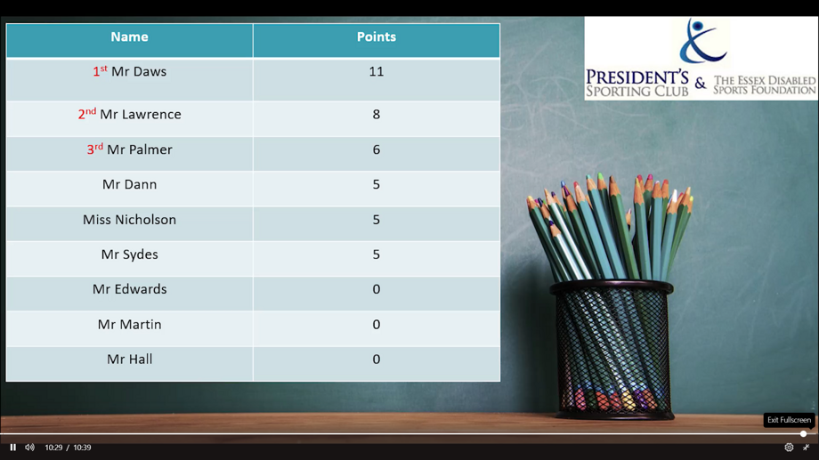 Contestants Mr Conor (PE), Mr Palmer (PE), Mr Sydes (Business), Mr McGee (Head of MFL), Mrs Nicholson (Head of Maths), Mr Dann (Head of PE), Mr Lawrence (PE), Mr Hall (IT Support), Mr Edwards (SCITT Trainee) and Mr Daws (Head of Social Sciences) all put their footie skills to the test. Inevitably, there were more misses that hits, however surprise guest star, Mr White, dressed in his suit and tie, took the limelight by hitting the crossbar on his one and only attempt!