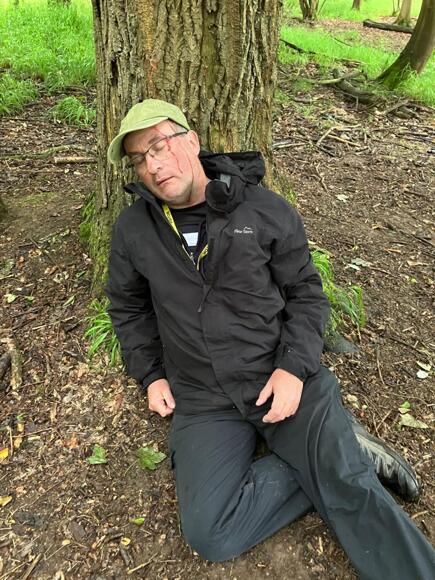 First aiding at an aeroplane crash - carrying Mr Beardsworth and Mr Robertson on a stretcher!