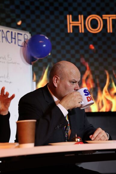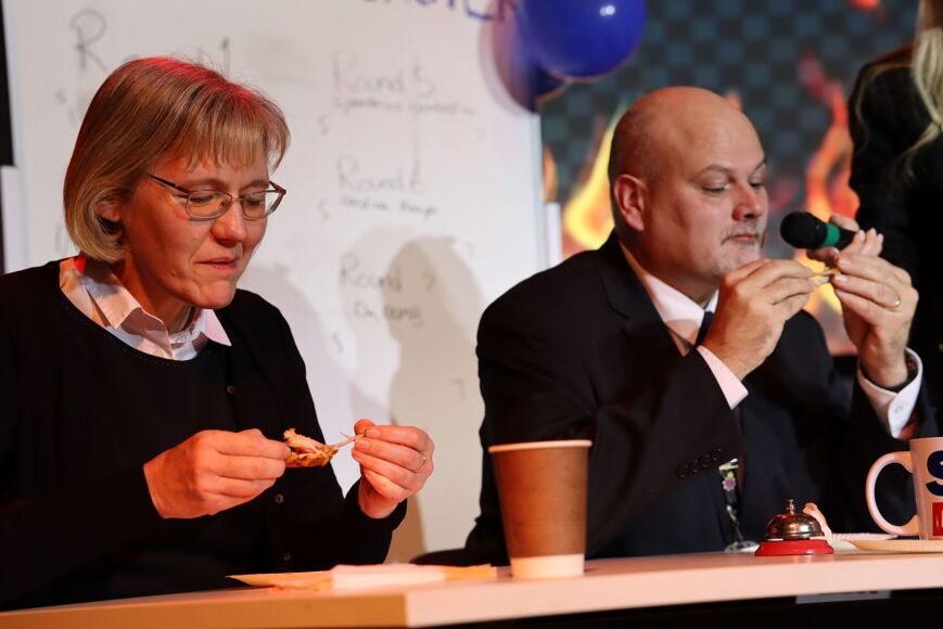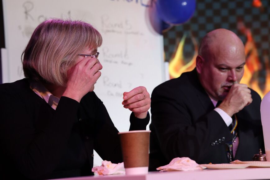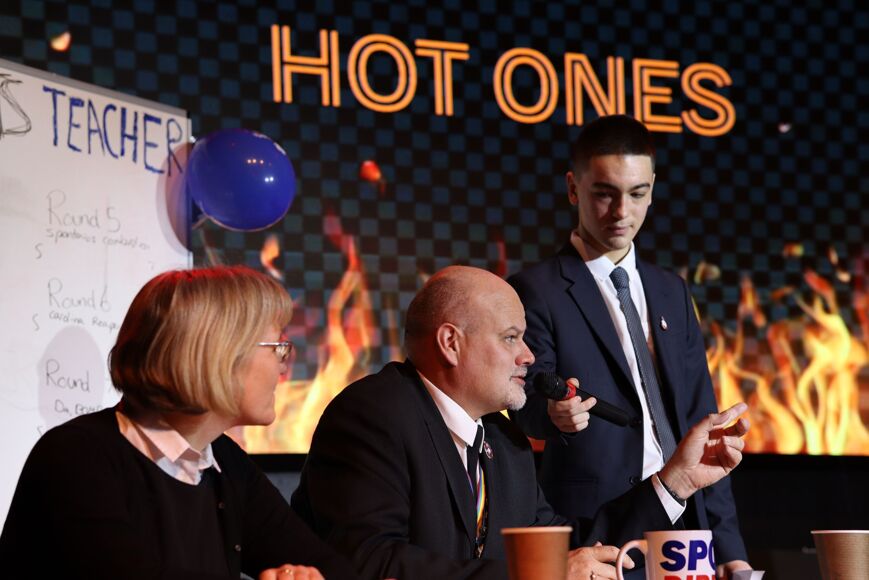 Mr Beardsworth and last-minute stand-in Miss Wright took to the stage and challenged sixth-formers Shea Reynolds and Stanley Stafford to a battle of brains as well as taste buds (or lack thereof) in a fight to withstand the heat...with plenty of water, milk and tissues at the ready!