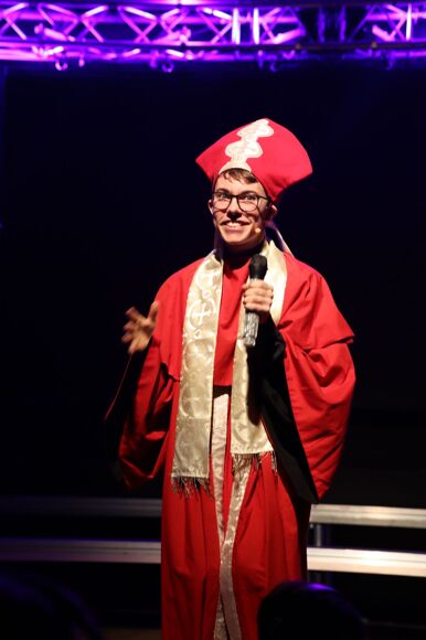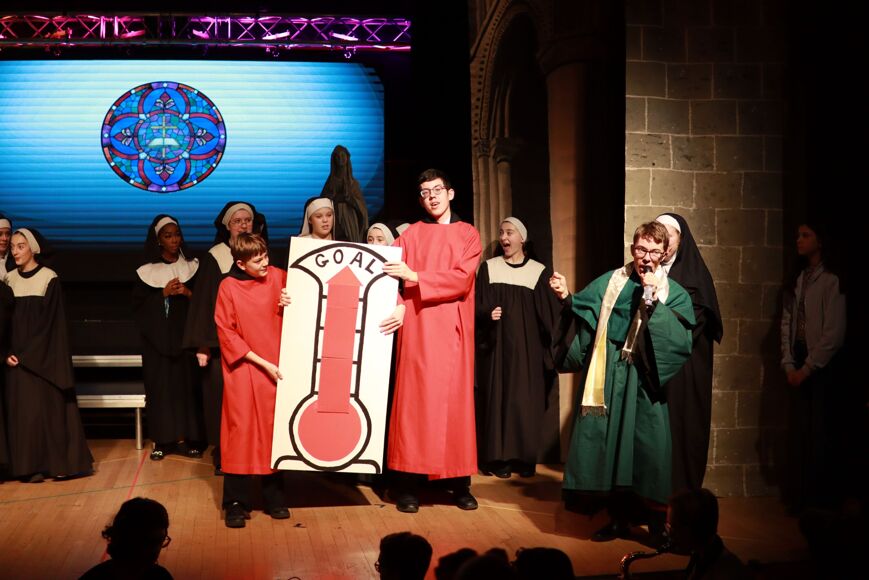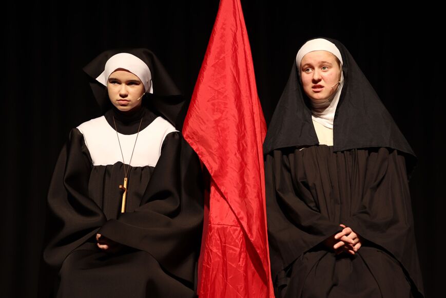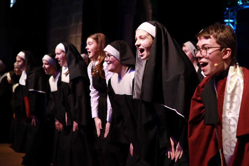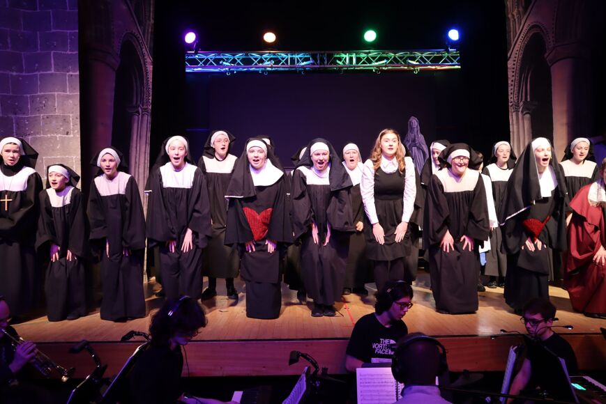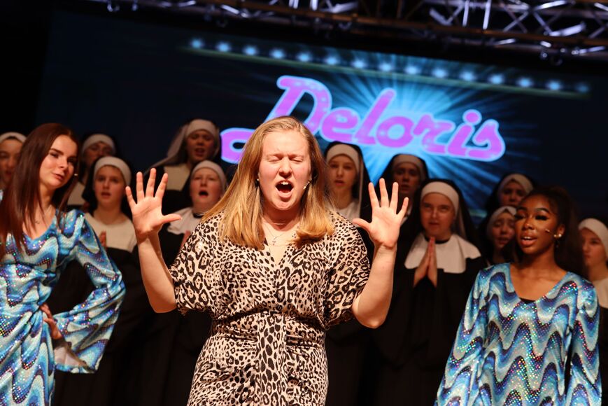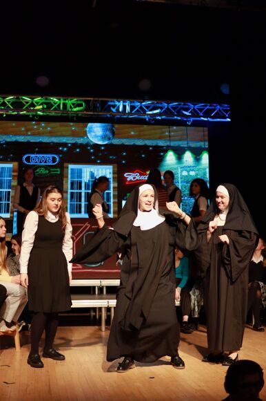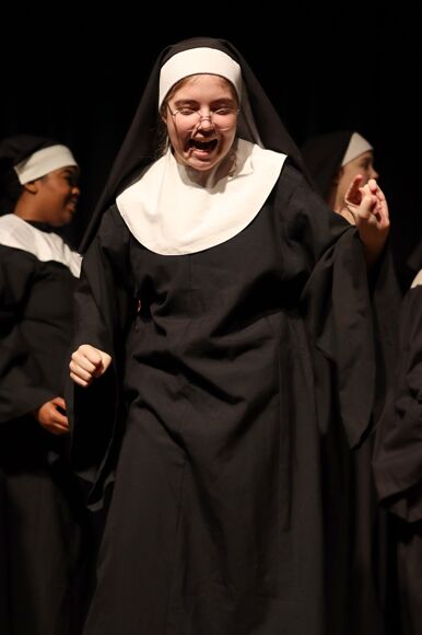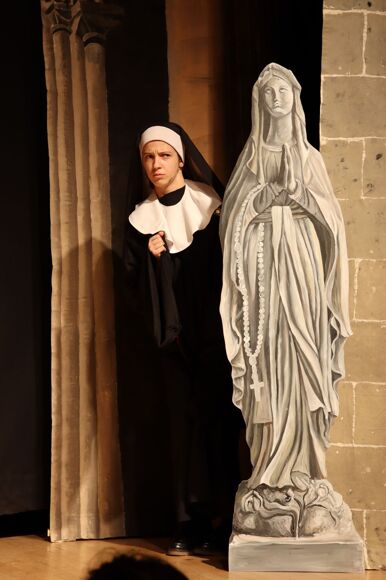 It is always amazing to see just how much talent our students possess during school shows and this one does not disappoint! Jemima Smith (Y11), who plays the lead, is pitch-perfect in her vocals and conveys Deloris' wit and humour along with her sassy attitude. She is joined by her nun sisters, played hilariously by Maira Thira (Y12) and Summer Waite (Y10) as they hip-hop and rock their way to bringing the nun's choir into the 21st century and the attention of the Monsieur O'Hara, played by Ben Barrett.