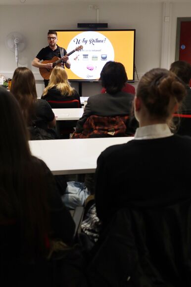 Retune (www.retunewellbeing.com) is a charity that focuses on helping to improve mental wellbeing through creative outlets such as music. They held a workshop in school on Tuesday that was open to Year 11 and 13 students who wished to sign up. The event was held by Tom Ryder and Greg Camburn, who are the founder and CEO of the charity respectively. Tom led the majority of the event with occasional interjections (and playing of a penny whistle) from Greg.