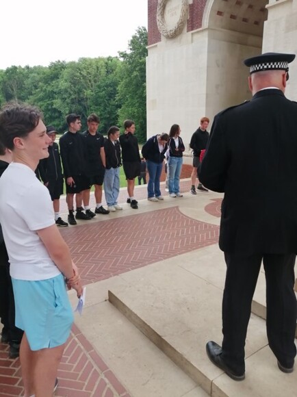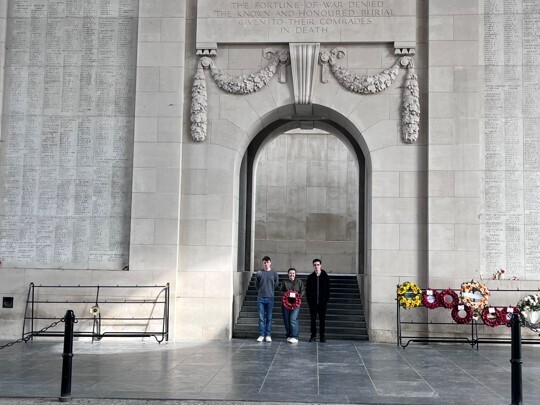 At the Thiepval Memorial to the Missing, Thomas Hewitt laid a wreath on behalf of Leventhorpe and his relatives whose names are on the memorial. It was an emotional moment. Emily and Millie were Thomas’ Guard of Honour, and Joe read the Exhortation. Josh placed a cross on the headstone of his relative who died and is buried at the Commonwealth War Graves, part of the cemetery at Etaples, France. Sophie Belson laid a wreath on behalf of Leventhorpe at the Menin Gate Memorial, which contains the names of 54,000 officers and men whose graves are not known, along with her Guards of Honour, Flynn and Freddie.