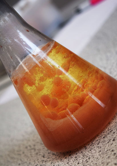 - Break your fizzy tablet in half and drop part of it into the bottle. Get ready… here come the bubbly blobs!