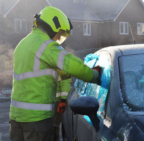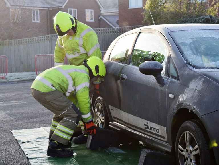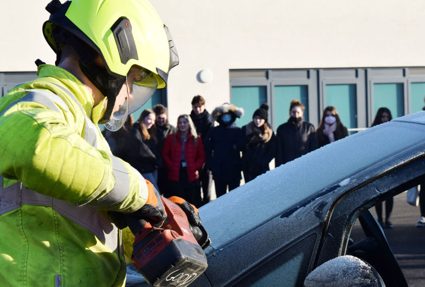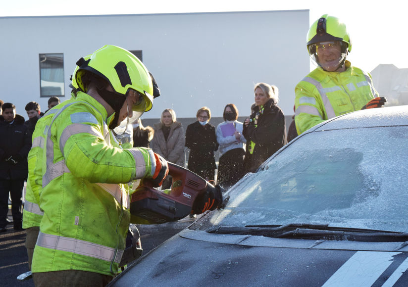 Students saw how the fire service will initially stabilise the vehicle before removing the window glass to prevent further injuries. Having then assessed where it is safe to cut through the sections of the vehicle, the firefighters proceeded to remove the driver's door and boot lid before cutting off the roof in order to most quickly and safely access an injured and/or trapped person(s) inside.